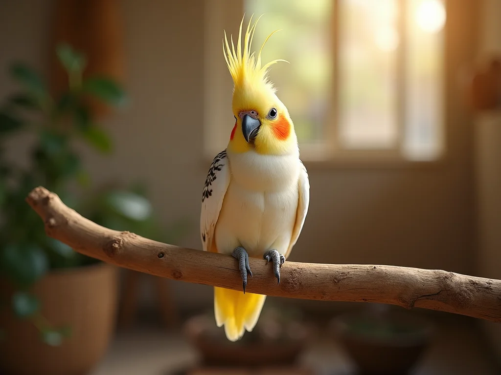 Viveiro para calopsita posicionado em um canto de sala, longe de janelas e correntes de ar, com iluminação ambiente suave.